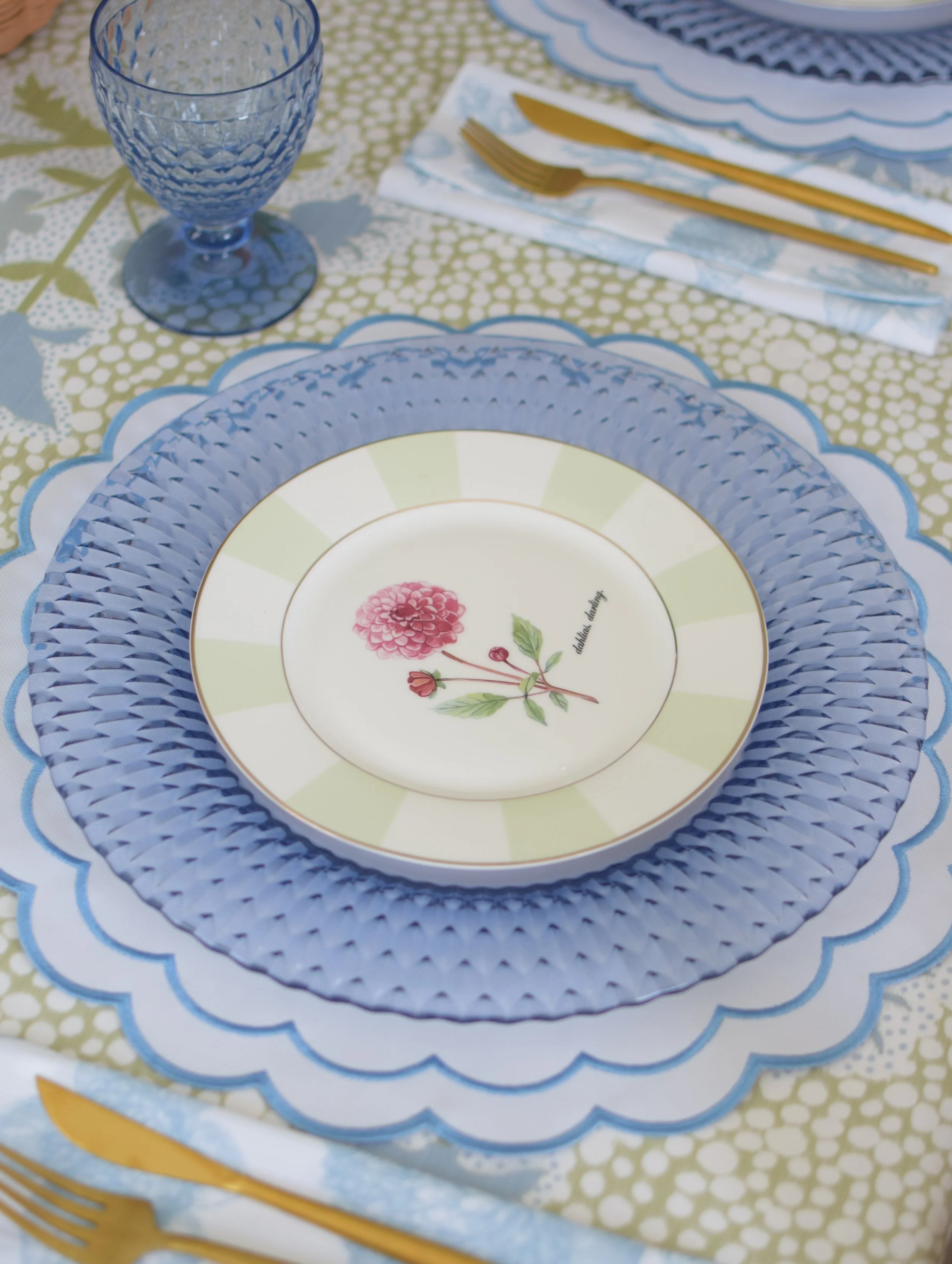 The plate has a metallic inner and outer rim and a soft green and white blocked border.